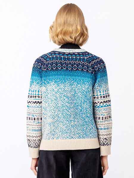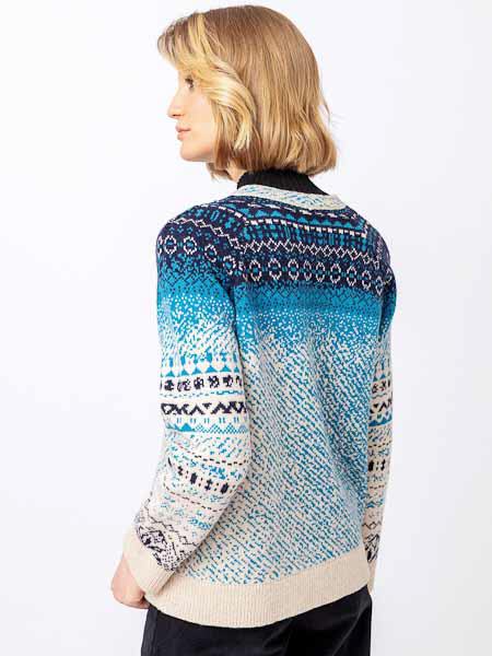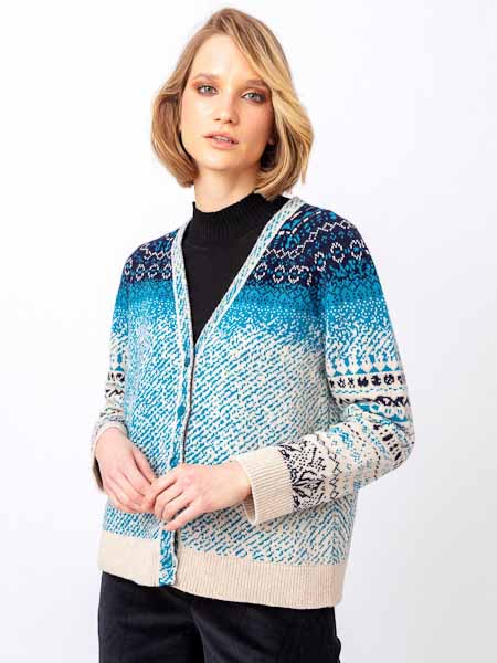 ist die Grundfarbe dieser schönen dicken Strickjacke von Ivko, im Norwegermuster gestrickt mit kleinen geometrischen Mustern mit den Farben petrol (fast türkis), dunkelblau. Sie hat einen tiefen V-Ausschnitt, sie wird mit petrolfarbenen Knöpfen geschlossen. Sie ist gerade geschnitten.