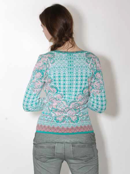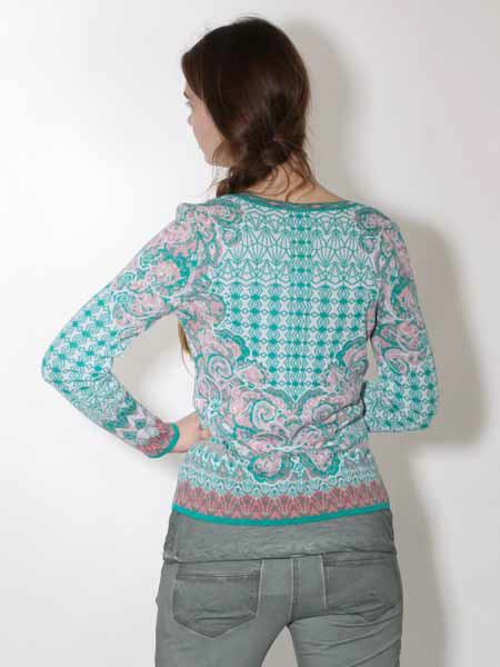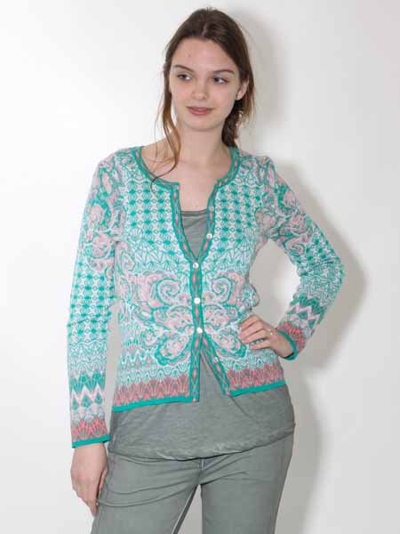 in den Farben weiß, grün und rosa ist diese Strickjacke von Kooi gearbeitet, Natur pur aus Baumwolle. Sie wird mit kleinen Perlmuttknöpfen geschlossen. Sie ist leicht tailliert. Länge ca. 58 cm.