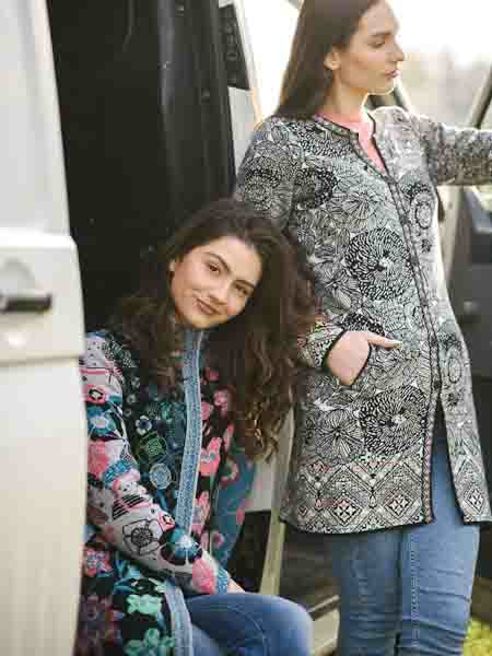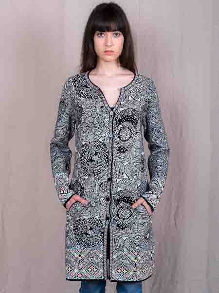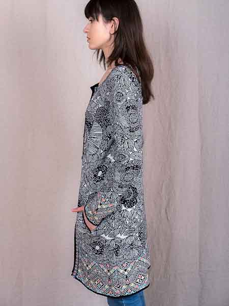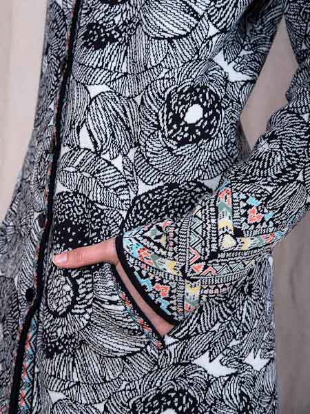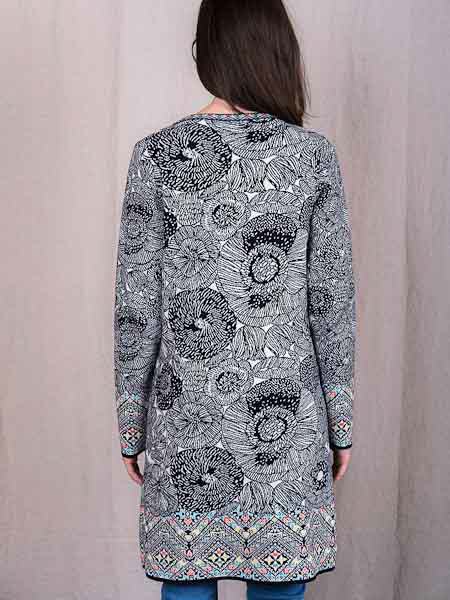 ist dieser schöne Strickmantel von Kooi gestrickt, in Jacquardmustern mit stilisierten floralen Motiven und Ornamenten gestrickt. Sie wird mit kleinen Knöpfen geschlossen. Sie ist leicht tailliert, zum Saum hin wenig ausgestellt. Die Saumkanten sind im breiten Bordürenmuster gestrickt. Der Strickmantel hat einen runden Halsausschnitt, darunter, einen kurzen V-Ausschnitt. Die Ausschnittblende, die Knopleisten und die Patten der 2 Taschen sind im kleinen Bordürenmuster gestrickt mit schwarzer Kante. Die Baumwolle ist angeraut und kuschelig weich auf der Haut. Länge ca. 100 cm in Größe 38.