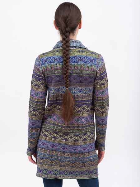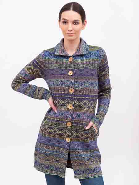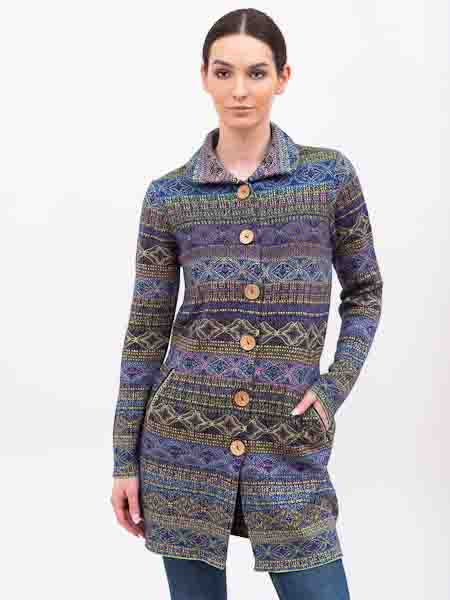 ist dieser Strickmantel von Kooi in den Farben violett apfelgrün schlamm pink dunkelblau jeansblau lindgrün, im Jacquardmuster mit kleinen Ornamenten und geometrischen Mustern gestrickt. Diesen Strickmantel können Sie indoor und outdoor tragen. Er hat 2 Pattentaschen. Vorder- und Rückenteil sind zum Saum hin leicht ausgestellt. Die Baumwolle-/Wollmischung ist kuschelig weich auf der Haut. Länge ca. 97 cm in Gr. 40.