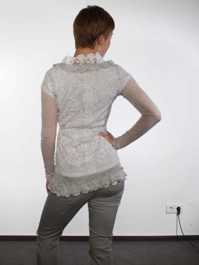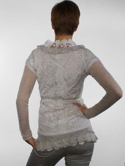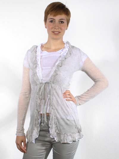 ist diese silbergraue Jacke aus federleichtem Strickstoff von Fille des Sables. Die Ausschnittkanten sind geschmückt mit weißen Spitzenbordüren. Die Jacke hat an der Taille am Rückenteil einen Gummidurchzug und vorne Bänder, mit denen man die Weite verändern kann. Das Rückenteil ist weiß bedruckt. Länge der Jacke ca. 75 cm. Wir haben einige Shirts passend dazu.