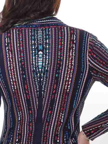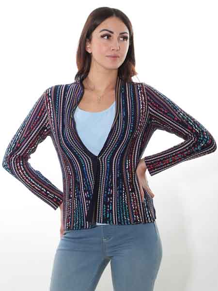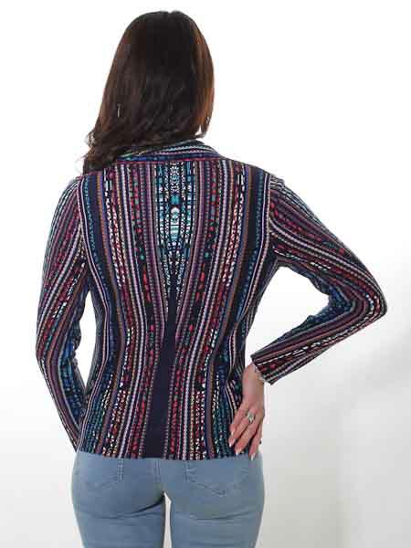ist die Grundfarbe dieser schönen Strickjacke von Ivko, quer gestrickt im Mustermix mit kleinen Mustern und Streifen in den Farben weiß rost blau türkis flieder apfelgrün. Sie hat einen tiefen V-Ausschnitt und einen angeschnittenen Kragen, auch umgeschlagen als Bubikragen zu tragen. Sie ist mit einem Knopf etwas oberhalb der Taille geschlossen. Sie ist tailliert, zum Saum hin leicht ausgestellt. Die Strickjacke fällt relativ groß aus.
