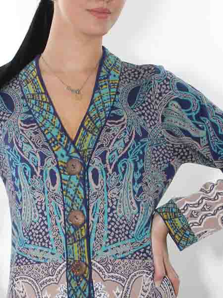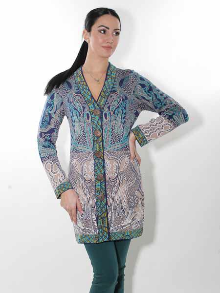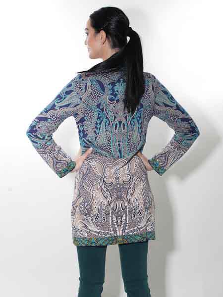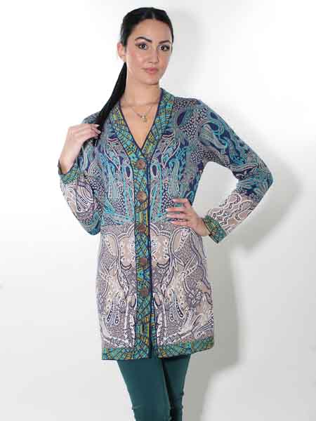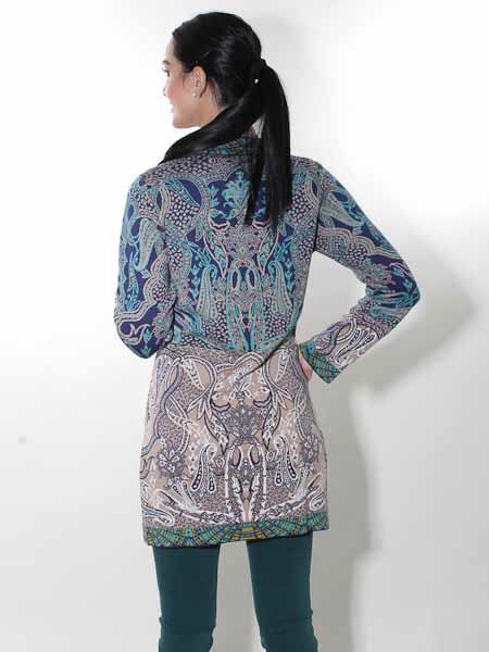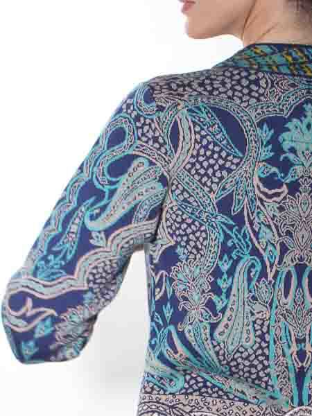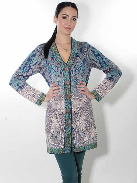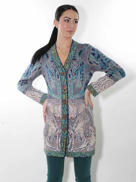 ist diese lange Strickjacke von Glückspilz in den Farben königsblau, türkis, wollweiß, ein helles taupe und ein wenig senfgelb in den Bordüren, im Jacquardmustern mit Paisleys und floralen Motiven gestrickt. Sie wird mit großen Knöpfen geschlossen. Sie ist leicht tailliert. Die Saumkanten und die Ausschnittblenden sind im Bordürenmuster gestrickt. Die Mischung aus Baumwolle und Wolle ist angenehm weich auf der Haut. Länge ca. 86 cm in Gr. M.