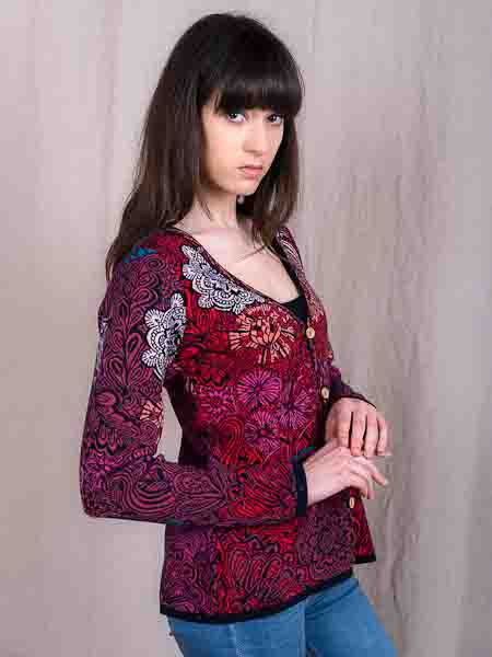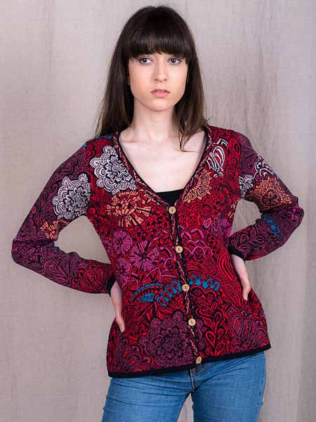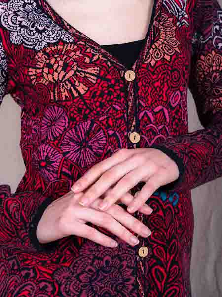 ist diese schöne Strickjacke von Kooi in den Farben rot, schwarz, mauve, pink, cyclam, apricot, hellrosa und petrol, im Jacquardmustern mit Paisleys, mit floralen Motiven und Ornamenten gestrickt. Sie wird mit holzfarbenen Knöpfen geschlossen. Sie ist leicht tailliert. Die Saumkanten sind uni schwarz. Die Ausschnittblende ist im Bordürenmuster gestrickt. Die Baumwolle ist angeraut und kuschelig weich auf der Haut. Länge ca. 64 cm in Größe 38 und 69 cm in Gr. 46.