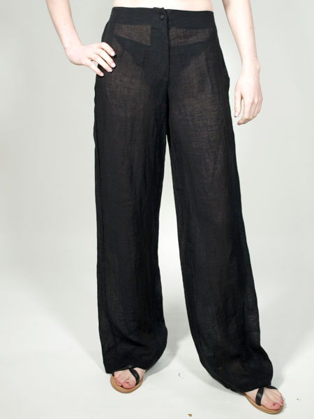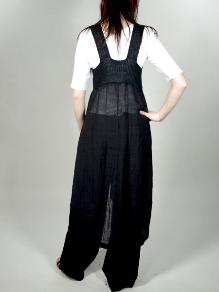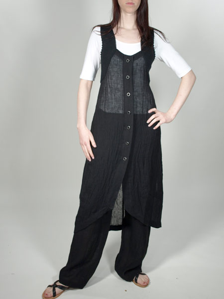 gestrickt sind die Träger und die Passe am Rückenteil dieser Tunika von Crea. Aus leicht knittrigem Leinen ist sie gearbeitet, wird an der vorderen Mitte geknöpft. Die Tunika ist am Saum leicht ballonförmig geschnitten, hat Taschen in den Seitennähten. Wir haben eine dazu passende schwarze Leinenhose.