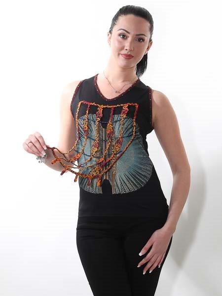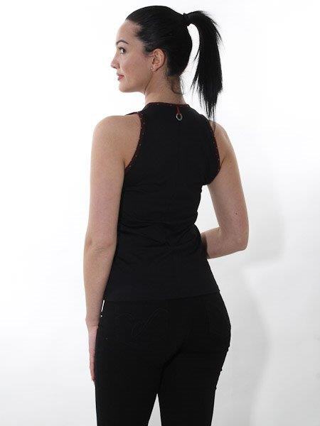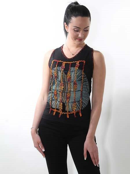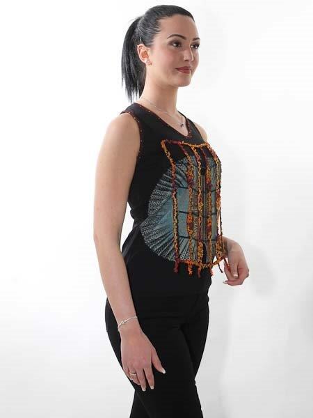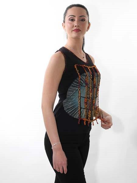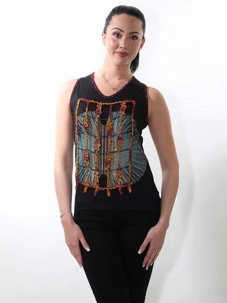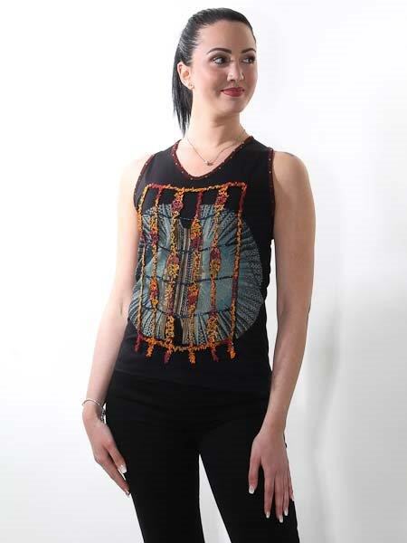 ist dieses Top von Save The Queen, aus stretchigem Material, die Ausschnittkanten sind eingefaßt in weinrot/oliv. Das bedruckte Vorderteil hat eine gitterartige Applikation aus Chenillebändern und ein wenig blauem Lurex. Schick für die nächste Party!