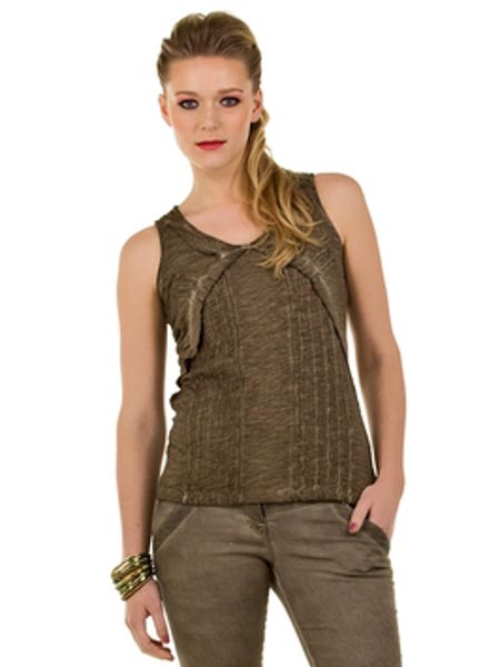 ist dieses Top von Yest, der verwaschene Jersey ist schräg verarbeitet, so dass der Jersey elastisch ist. Wir haben das Top in bronze vorrätig. Das Top besteht aus vielen Einzelteilen, die Nähte außen. Länge ca. 66 cm.