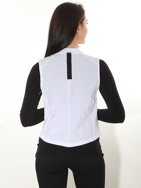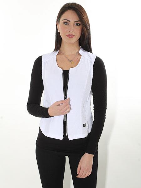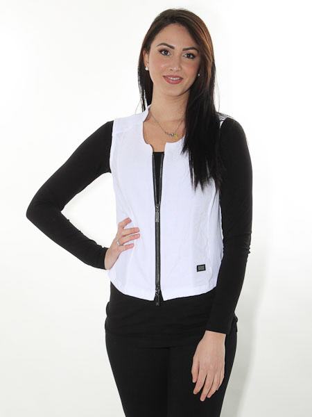 sind die Farben dieser schicken Weste von E-Potempa, aus einem weißen Rippenjersey und einem weißen gecrashten Stoff. Raffiniert ist der Halsausschnitt. Die Weste wird mit einem schwarzen 2-Wege-Reißverschluß geschlossen. Die Mitte des Rückenteils ist betont mit einer schwarzen Applikation. Der Saum am Vorderteil ist gerundet. Länge ca. 54 cm am Rückenteil, an den Vorderteilen ca. 59 cm in Gr. M.