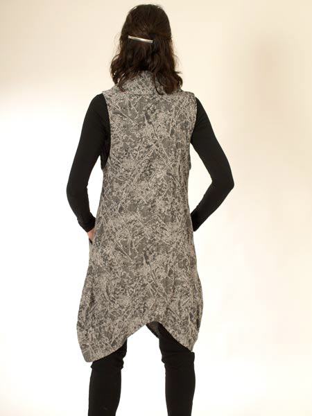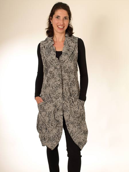 ist der strukturierte Stoff dieser schicken Weste von Manondesign in den Farben silber/grau. Die Weste ist tailliert, zum Saum hin leicht ballonförmig. Länge vorn an der längsten Stelle ca. 110 cm, hinten ca. 85 cm an der hinteren Mitte.