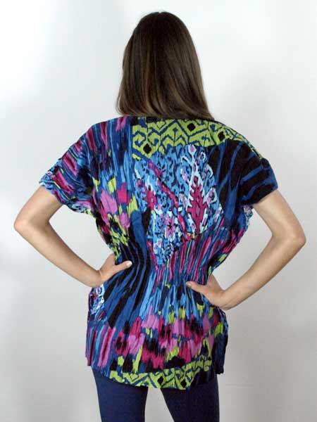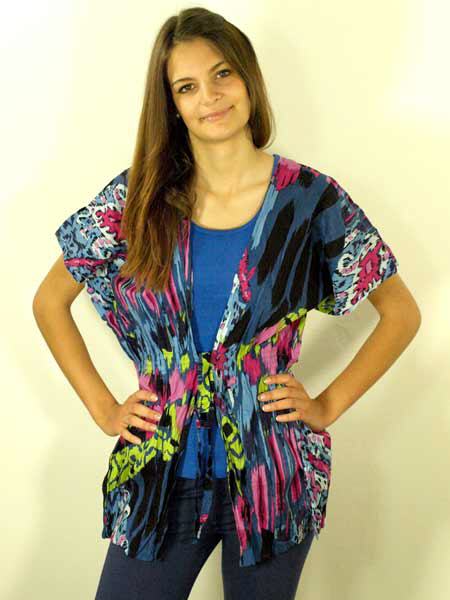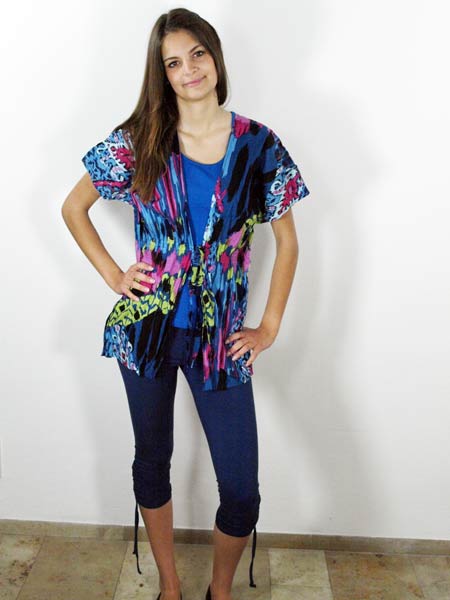 und bequem ist diese sommerliche Weste von Yest, blau/bunt-bedruckt. Die Weste ist in der Taille gesmokt und wird mit Bändern geschlossen. Wir zeigen dazu Leggings, supermodisch und lässig. Die Weste ist ideal über Tops, wenn es zu "nackt" am Arbeitsplatz ist an heißen Tagen. Länge der Weste ca. 77 cm cm.