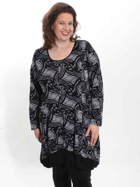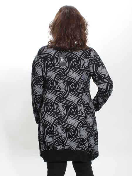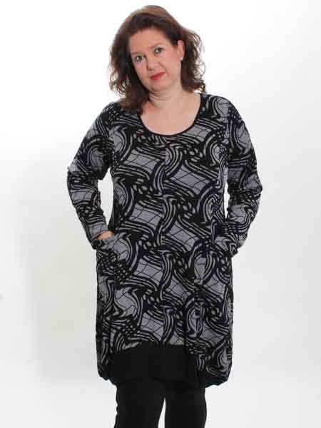 im Schnitt ist dieses Jerseykleid von Boheme, gestrickt in schwarz/grau, nicht gedruckt. Es ist am Saum leicht ballonförmig geschnitten, ist an den Seitennähten etwas länger als an der Mitte von Vorder- und Rückenteil, hat 2 bequeme Taschen. Dieser Schnitt ist sehr figurfreundlich. Länge des Kleides ca. 106 cm an der Mitte, 116 an den Seitennähten. Sie können natürlich auch schmale Hosen darunter tragen.