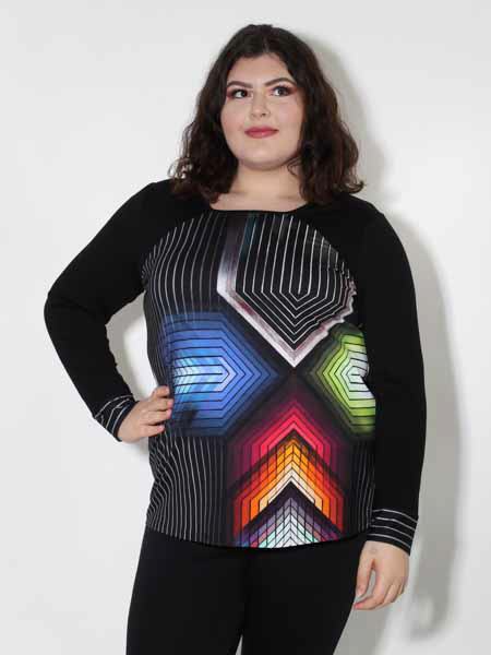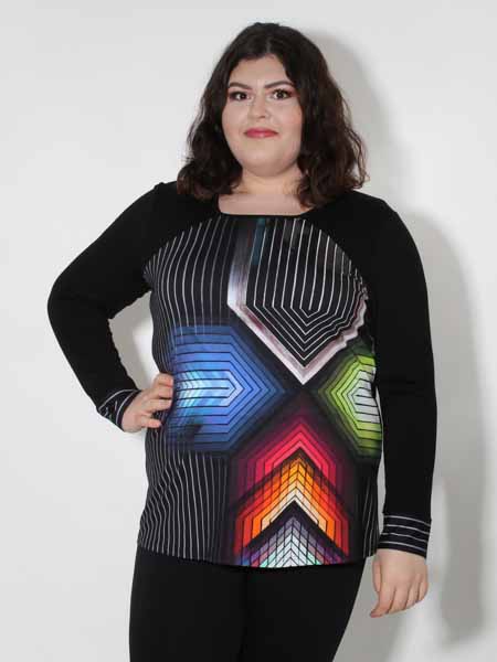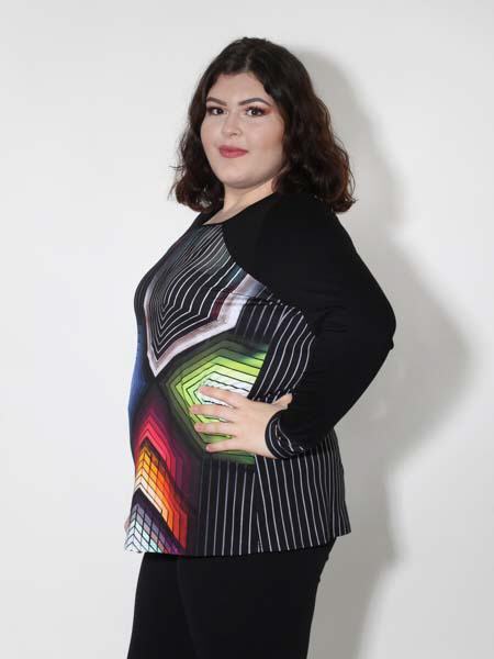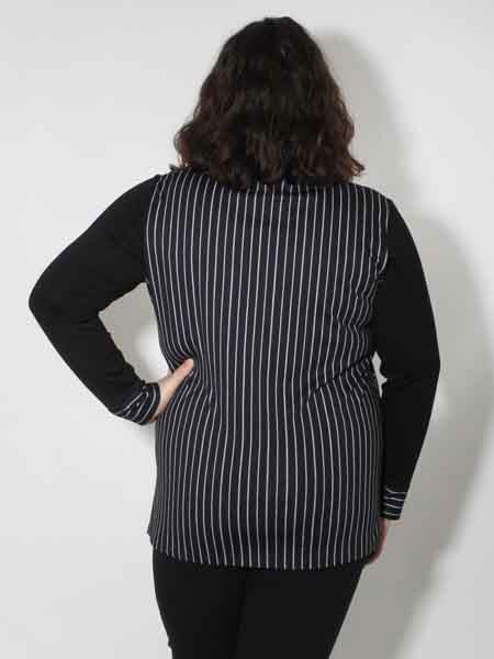 ist dieses schöne Shirt von Doris Streich, leicht tailliert. Die Armel sind lang. Es ist gearbeitet aus einem schwarzen Jersey und am Vorderteil mit einem mit grafischen Mustern bedrucktem Jersey, das Rückenteil ist partiell längs gestreift. Länge in Gr. 46 ca. 106 cm.