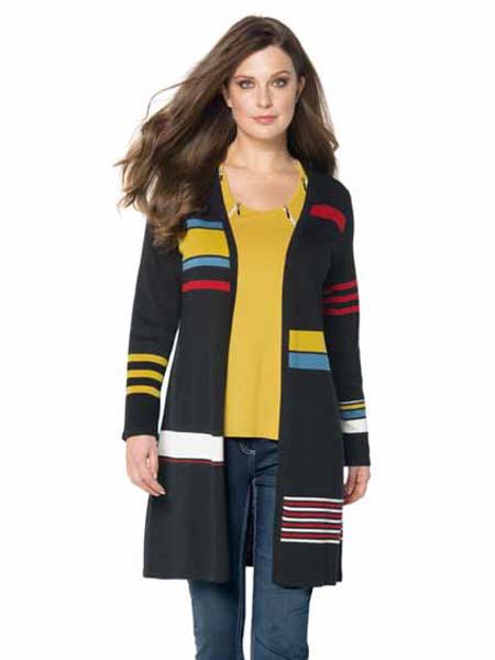 ist diese lässige Strickjacke von Doris Streich, schwarzgrundig, auf den Vorderteilen mit asymmetrisch angeordneten Streifen in rot, jeansblau, hellgelb. Länge ca. 92 cm in Gr. 50.