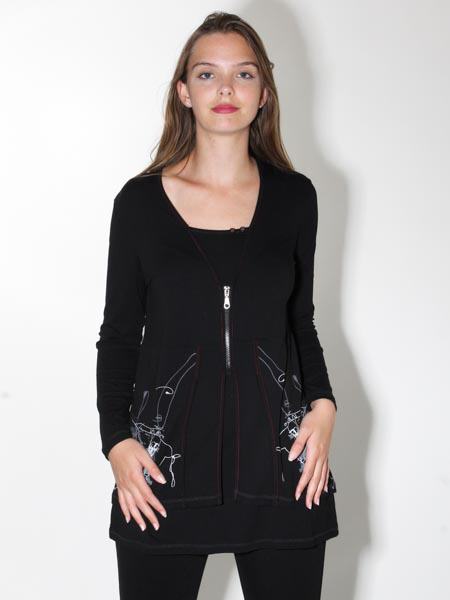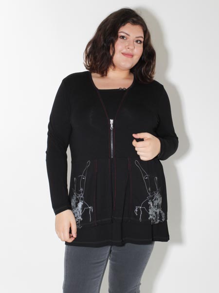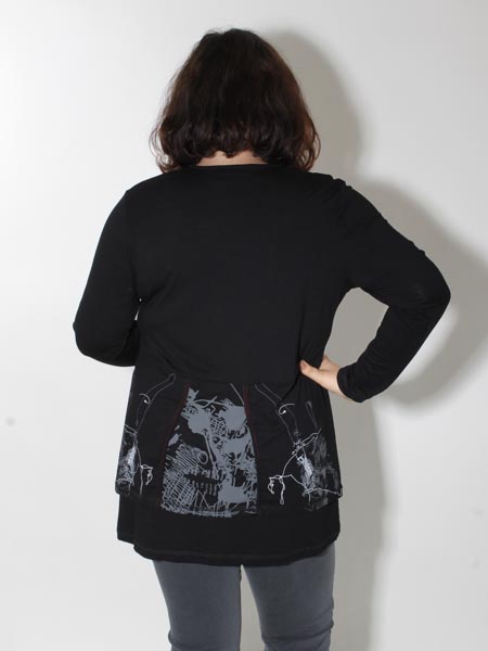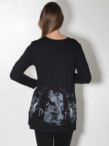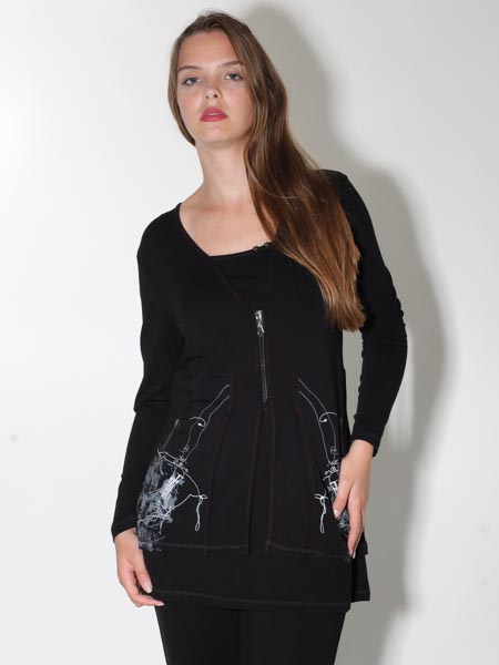erscheint diese aparte Tunika von Doris Streich, als hätten Sie ein Shirt mit Jacke darüber. Die Tunika ist aus schwarzem Jersey, vorn und hinten graffitiartig bedruckt in grau und weißen Strichzeichnungen. Viele Nähte sind betont mit roten Steppnähten. Die Knöpfe am Auscchnitt und der Metall-RV sind nur Zierde. Länge in Gr. 38 ca. 80 cm, in Gr. 46 ca. 85 cm.