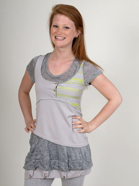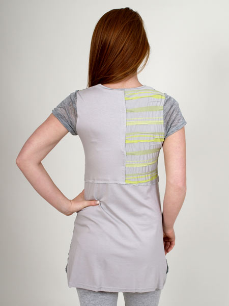 ist der glänzende Jersey bei dieser Tunika von Franck Anna, in den Größen 38-52. Der grau/gelbe Jersey ist strukturiert mit Biesen, der graue Jersey ist glatt. Die Tunika ist am Saum vorn leicht ballonartig, Länge ca. 78 cm.