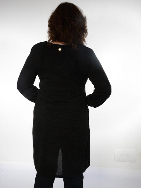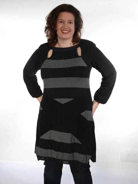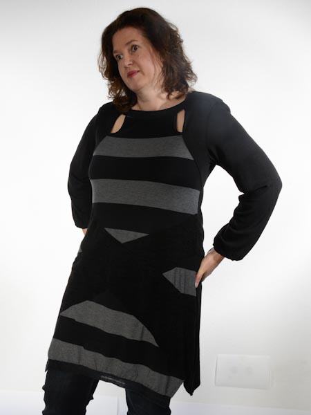 Raffiniert im Schnitt ist dieses Kleid von Mat, im Materialmix aus schwarzem Jersey, schwarzem Strickstoff und Jersey in Streifen schwarz/anthramelange. Sexy sind die Einblicke am Halsausschnitt. Die Weite am Handgelenk läßt sich verändern. Das tolle Kleid ist am Saum leicht ballonförmig geschnitten. Sie können auch schmale Hosen oder Leggings darunter tragen. Länge am Vorderteil ca. 102 cm, am Rückenteil ca. 106 cm.