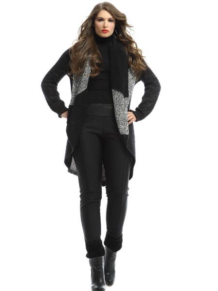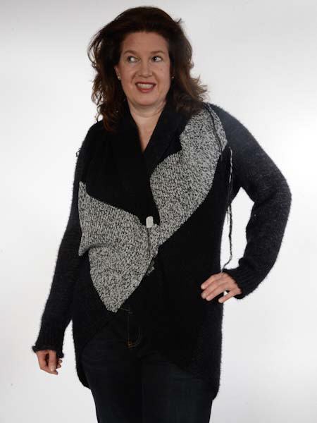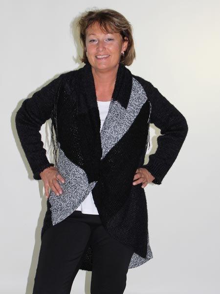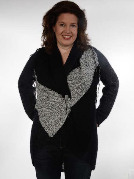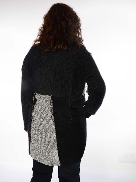 ist dieser leichte Strickmantel in schwarz/weiß mit weich fallendem Kragen von Mat. Er wird mit einer großen schwarzen Metallnadel geschlossen. Länge des Strickmantels ca. 90 cm.