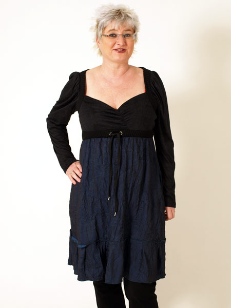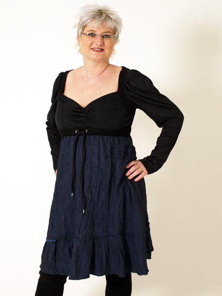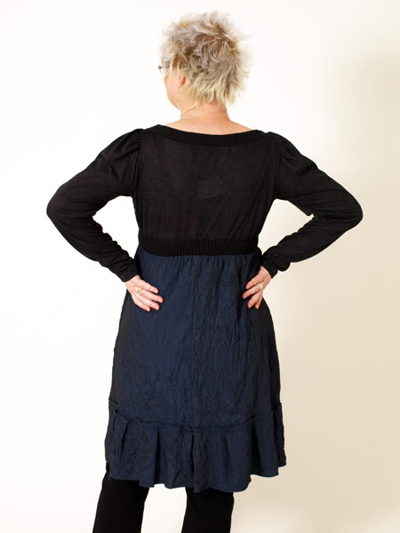 hat dieses Kleid von Mat, variabel in der Weite, mit Kordeln verstellbar. Gecrasht ist der dunkelblaue Stoff des Rockteils. Die Ärmel sind leicht angekraust. Bequem sind die Taschen in der Seitennaht. Länge ca. 100 cm.