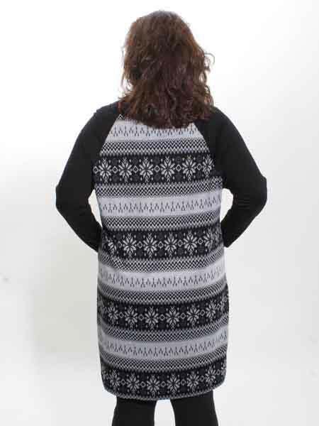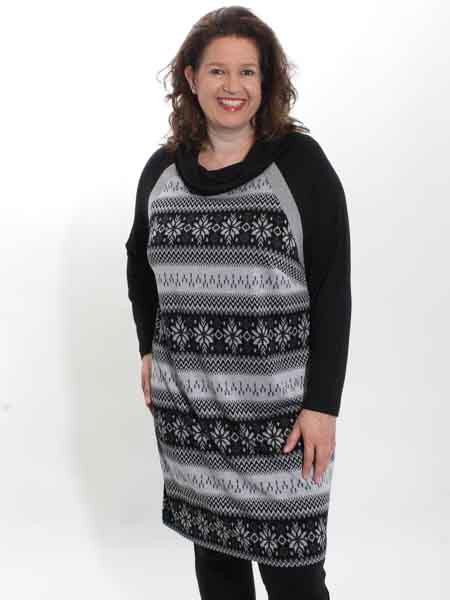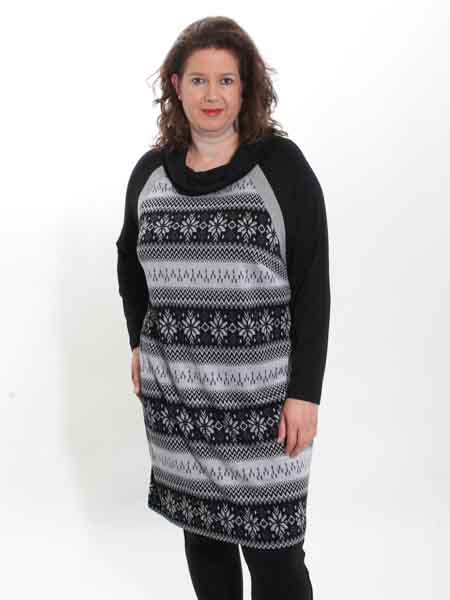 in schwarz/grau bedruckt ist der Jersey dieses Kleides von Maxima, kombiniert mit uni schwarz und graumelange. Der Druck wirkt wie ein Strickmuster. Dieses Modell einen weichfallenden Rollkragen. Länge ca. 104 cm. Wir zeigen darunter schwarze Treggings von X-Two.