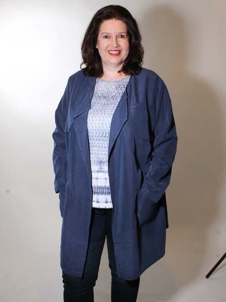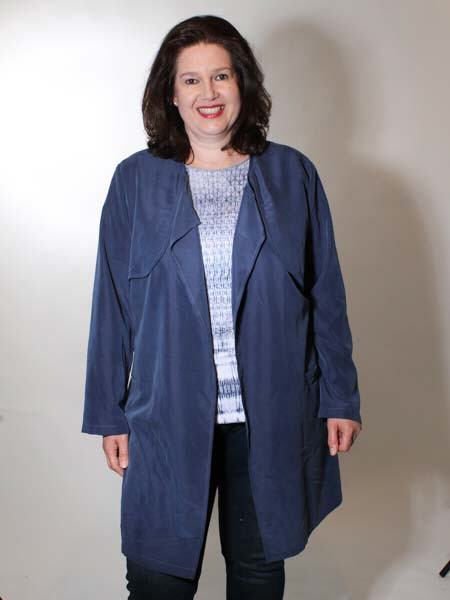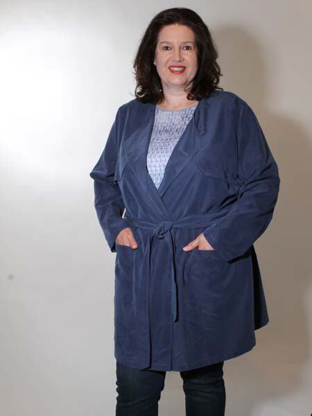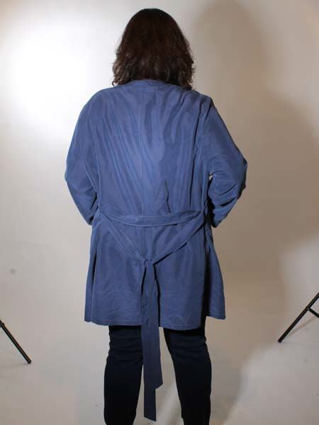 ist der blaue Stoff dieses lässigen Sommermantels, Trenchcoats von Maxima. Den Gürtel können Sie am Rücken knoten oder wenn Sie den Mantel schließen wollen, nach vorn knoten. Er hat 2 bequeme Eingrifftaschen. Länge ca. 95 cm.