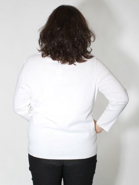 hat dieses Baumwoll-Shirt von no secret, wir haben es in wollweiß vorrätig, es fällt relativ groß aus. Die Ausschnittkante und die Knopfleiste sind aus Baumwollwebstoff, Ton-in-Ton mit dem dicken Jersey des Shirts. Länge des Shirts ca. 72 cm.