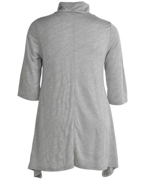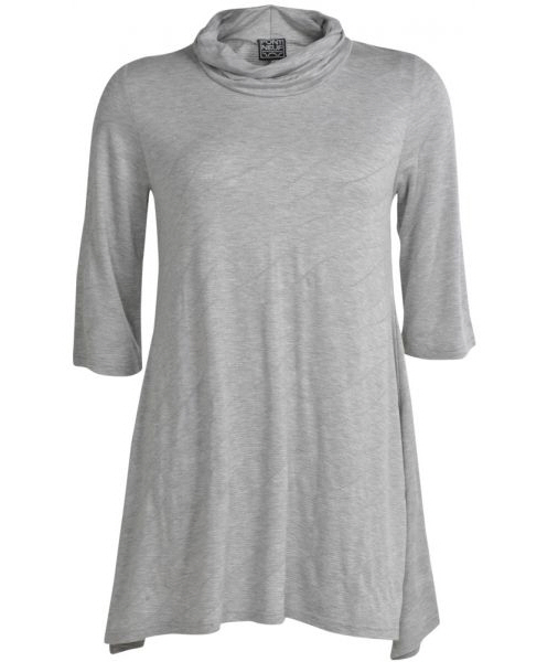ist dieser bequeme Rolli von Pont Neuf, aus leichtem Strickstoff in hellgraumelange mit diagoanlen Steppungen. Die Ärmel sind 3/4 lang. Der Saum ist zipflig. Länge des Pullis ca. 87 cm.