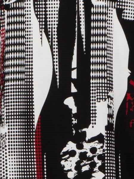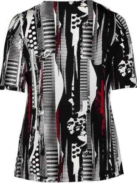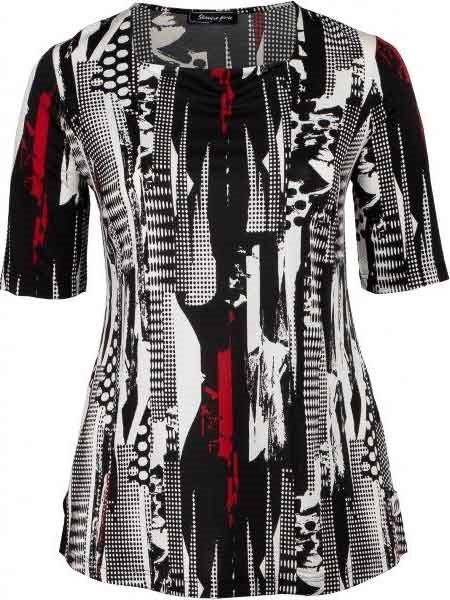 mit ein wenig rot ist der Viscosejersey dieses langen Shirts von Sempre piu. Es ist leicht A-förmig geschnitten. Es hat einen quadratischen Ausschnitt. Die Ärmel reichen bis zum Ellbogen. Länge ca. 89 cm in Gr. 52.