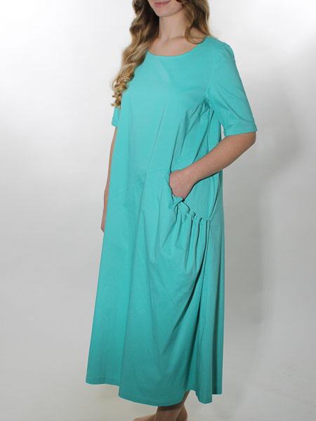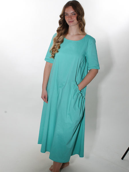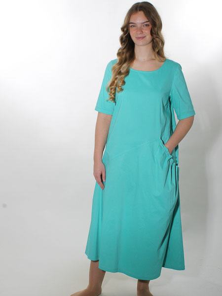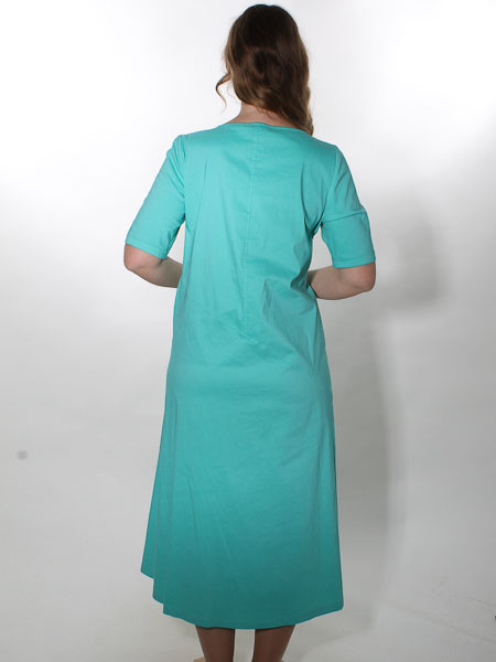 ist die Farbe des leicht elastischen Stoffes bei diesem bequemen Kleid von Vetono. Es ist A-förmig geschnitten an Vorder- und Rückenteil. Raffiniert ist die asymmetrisch angeordnete Tasche, deren Weite oben mit Bändern gerafft ist. Die Ärmel reichen bis zum Ellenbogen. Länge ca. 126 cm in Gr. II.
