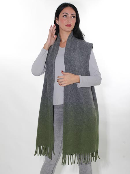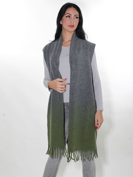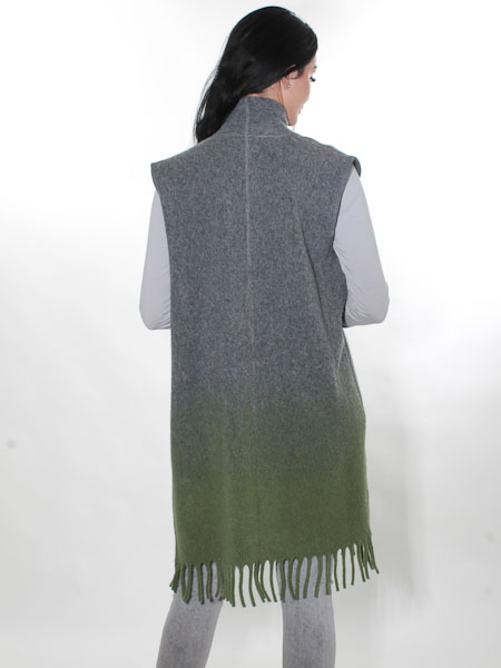 hat diese lässige kuschelige Weste von Vetono, aus einem Strickstoff im Farbverlauf von graumelange nach grün. Sie ist gerade geschnitten, verschlußlos. Mit einer Metallnadel können Sie die Weste beliebig geschlossen tragen. Sie hat einen angeschnittenen Kragen, sehr angenehm am Hals. Länge ca. 104 cm in Gr. II.