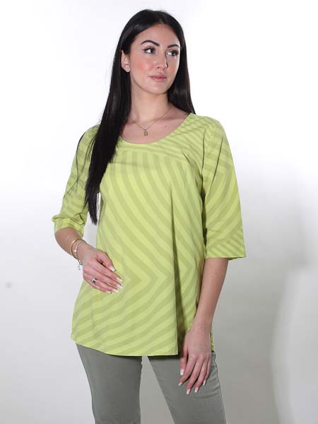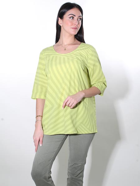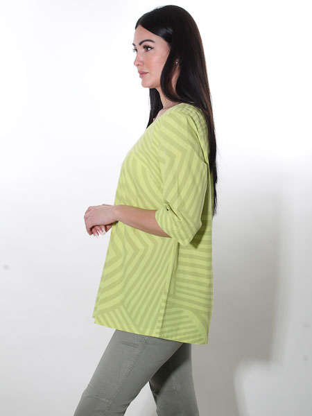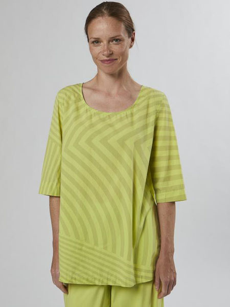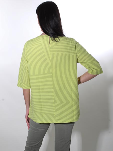 senkrecht, waagrecht, diagonal ist der Baumwollstoff, aus dem diese Blusenjacke von Vetono gefertigt ist, in der Modefarbe Limette. Sie hat einen runden Halsausschnitt, hat an der hinteren Mitte einen Schlitz mit Knopf und Schlaufe. Sie ist leicht A-förmig geschnitten. Die Ärmel reichen über den Ellbogen. Länge ca. 74 cm in Gr. III.