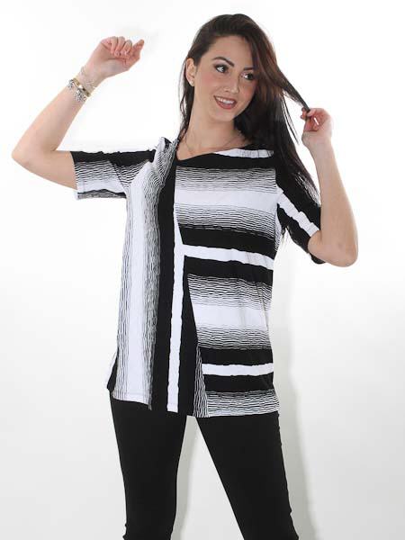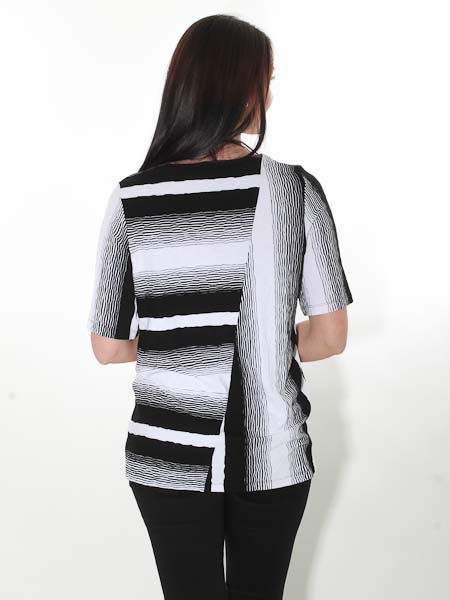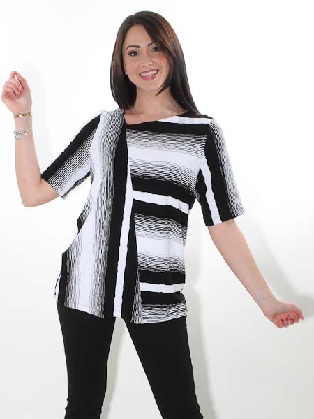 ist dieses Tunika von Vetono aus einem leicht strukturiertem Jersey im Wellenmuster in schwarz/weiß. Der elastische Jersey ist an Vorder- und Rückenteil mal senkrecht, mal waagrecht angeordnet. Der Halsausschnitt ist asymmetrisch. Die Ärmel reichen bis zum Ellenbogen. Länge ca. 77 cm in Gr. IV.