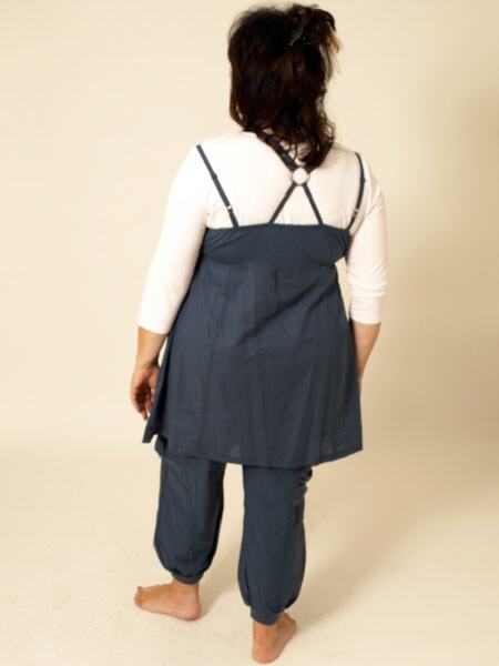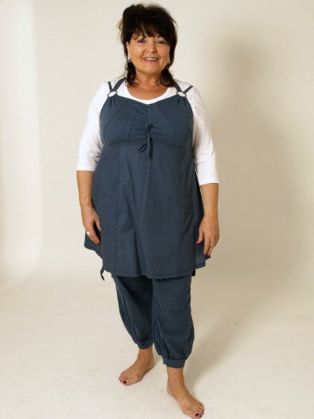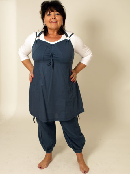 geschnitten ist diese Tunika von von x-two, a-förmig geschnitten, zum Saum hin ausgestellt, mit 2 Taschen. Raffiniert sind die Bänder am Ausschnitt, zusammengehalten mit großen Metallringen. Die Weite am Rückenteil ist variabel, mit einem Gummidurchzug. Länge der Tunika ca. 99 cm am Rückenteil. In stahlblau haben wir dazu passende Leggings im Angebot. Sie können Shirts darunter tragen oder auch mal solo am Strand über dem Badeanzug.
