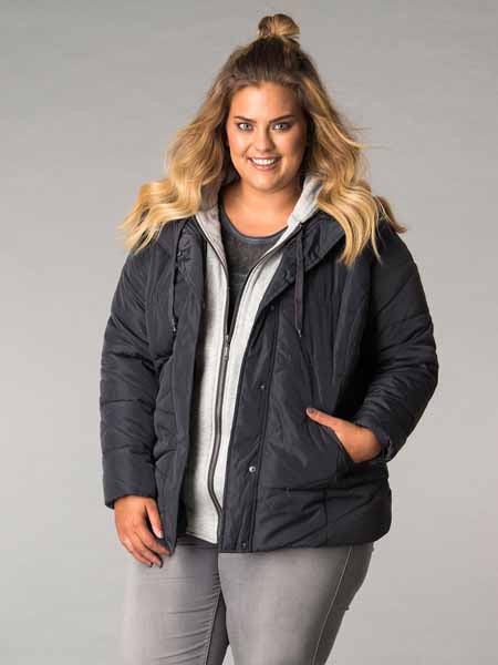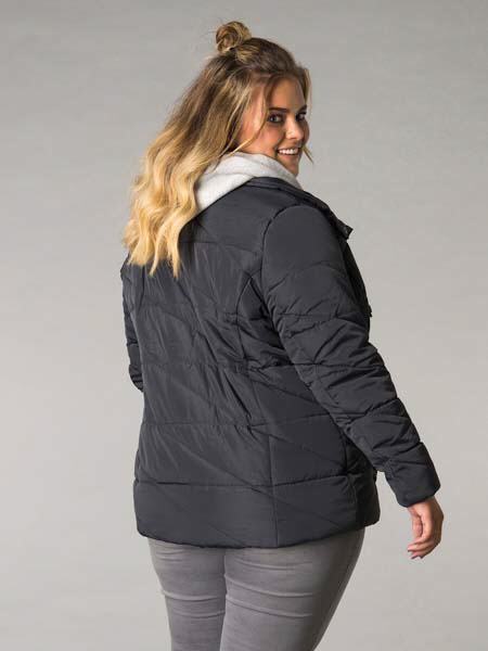 mit Sweatshirt darunter wirkt diese schicke, sportiche Outdoorjacke von Yesta, aussen wattiert in stahlgrauem, leicht glänzendem Stoff, innen wie ein hellgraumelangefarbenes Kapuzenshirt, ebenfalls wattiert, auch die Kapuze. Das Kapuzenteil ist etwas länger als die eigentliche Jacke, schaut am Saum etwas unter der Jacke hervor. Das Kapuzenteil wird mit Metall-RV geschlossen, die Jacke darüber mit Metalldruckknöpfen. Die Jacke hat 2 Patten-Taschen. Länge der Jacke ca. 79 cm.