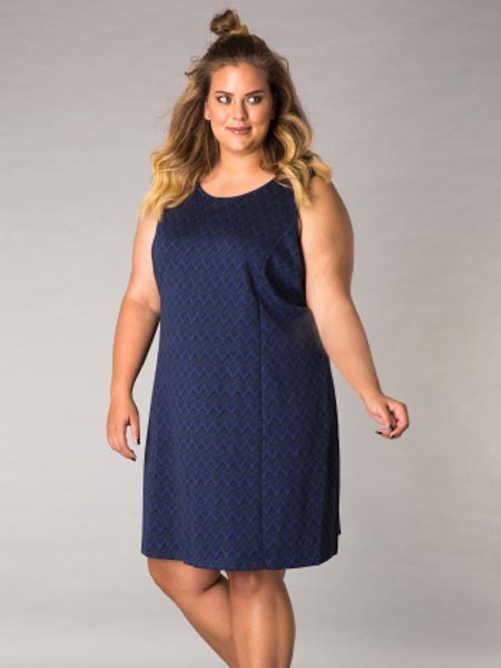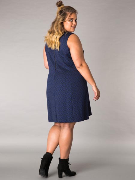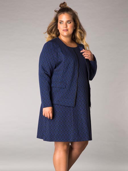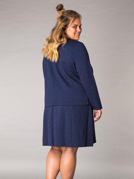 ist dieses aparte Kleid von Yesta aus einem Strickstoff in dunkelblau mit Zackenmuster in schwarz. Es ist leicht tailliert, zum Saum hin leicht ausgestellt. Länge ca. 106 cm. Passend dazu haben wir eine kurze Jacke, zusammen ein schickes Outfit für den Job und auch am Abend.