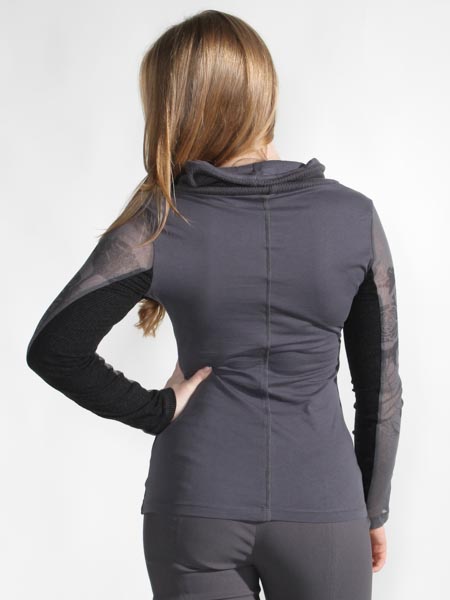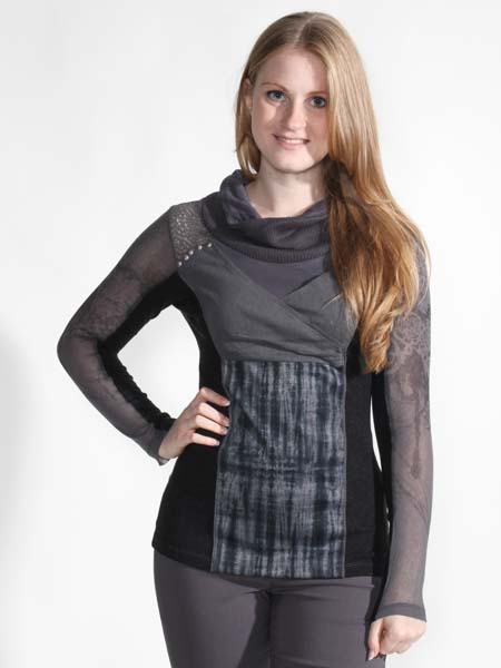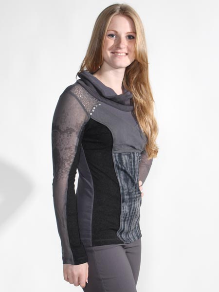 ist dieses Shirt in stahlgrau/anthra von Angles never die. Es ist im Muster- und Materialmix zusammengesetzt, aus Jersey, leicht transparentem Netzstofff, Häkelspitze und Rippenjersey. Die leicht transparenten Ärmel sind floral bedruckt. Der Rolli ist aussen aus Strickstoff, innen aus Jersey. Die Passe ist geschmückt mit silbernen Nieten. Länge ca. 65 cm.