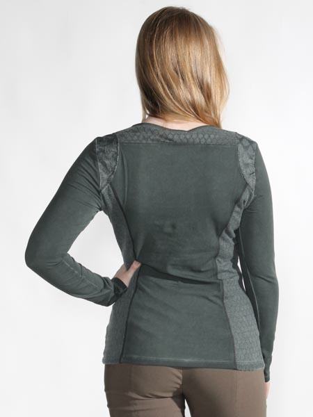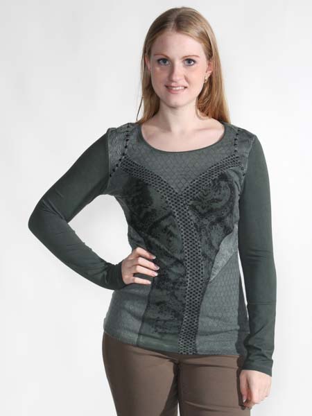 ist dieses Shirt in kahki/oliv von Angles never die. Es ist im Muster- und Materialmix zusammengesetzt, aus Jersey, mit Spitze bedrucktem Jersey, strukturierten Strickstoffen, Lochmusterjersey und Webstoff. Die Passe ist geschmückt mit schwarzen Nieten. Länge ca. 68 cm.