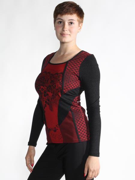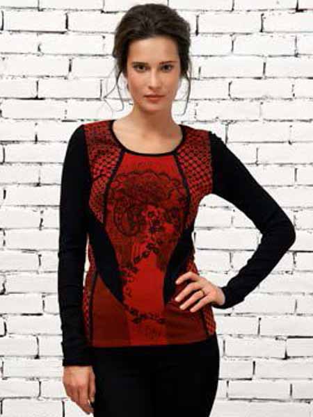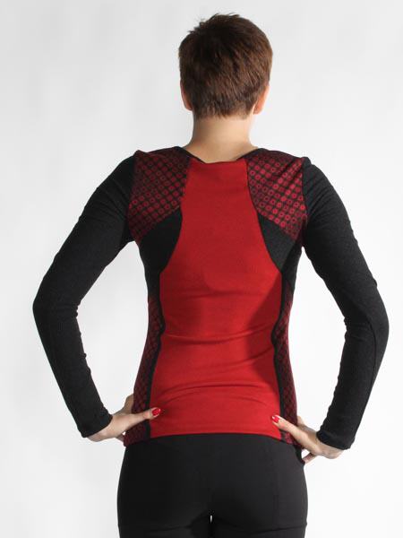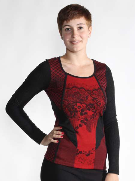 ist dieser Shirtpulli in schwarz/rot/weinrot von Angles never die. Er ist im Muster- und Materialmix zusammengesetzt, aus Jersey, mit Spitze bedrucktem Jersey, gemusterte Jerseystoffe in schwarz/weinrot und schwarzmelangefarbenem Rippenjersey. Länge ca. 67 cm.