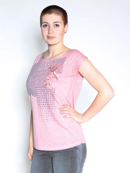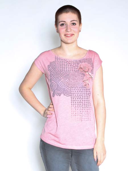 haben wir dieses Shirt von Angles never die, am Vorderteil bedruckt, bestickt und mit Perlmuttpailletten verziert. Die Schultern sind überschnitten. Länge ca. 70 cm.