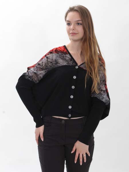 Material: bedruckter Stoff: 82% Viscose, 18% Seide, schwarzer Strickstoff: 95% Viscose, 5% Elasthan