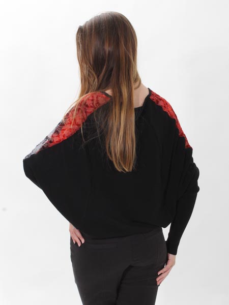 ist diese Strickjacke von Aventures des Toiles, mit Fledermausärmeln und schmalen, in Rippe gestrickten Ärmeln ab Ellbogen. Die runde Passe ist bedruckt mit dem Gemälde "Mademoiselle A" von Fabienne Rivory. Länge ca. 61 cm sam Rückenteil. Passend dazu haben wir ein Tuch.