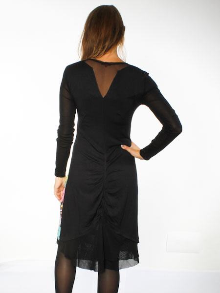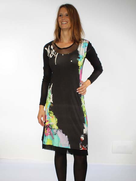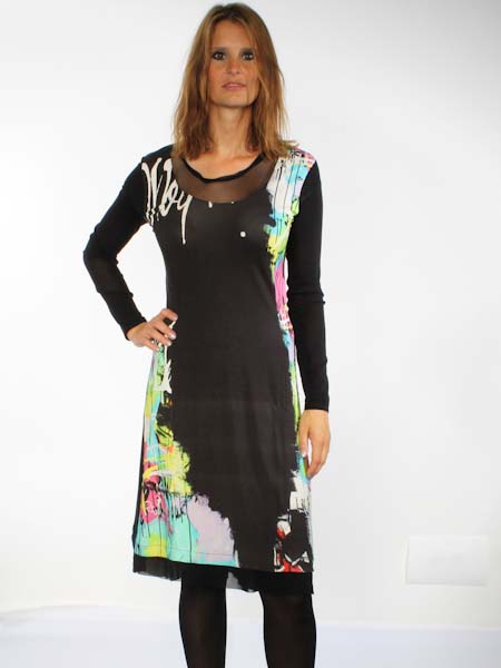 heißt das Gemälde von Pablo Morganti, mit dem dieses schicke Kleid von Aventures am Vorderteil bedruckt ist. Am Halsausschnitt und am Saum von Vorder- und Rückenteil hat es eine leicht transparente Kante aus schwarzem Netzstoff. Das uni schwarze Rückenteil ist in der Länge an der Mittelnaht am Rockteil gerafft. Länge des Kleides am Vorderteil ca. 106 cm, am Rückenteil ca. 111 cm.