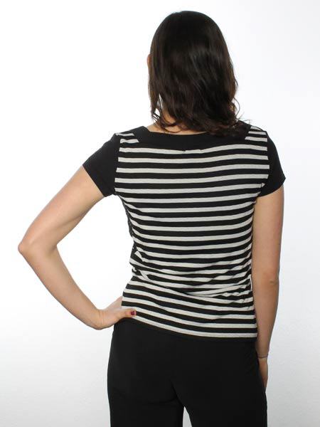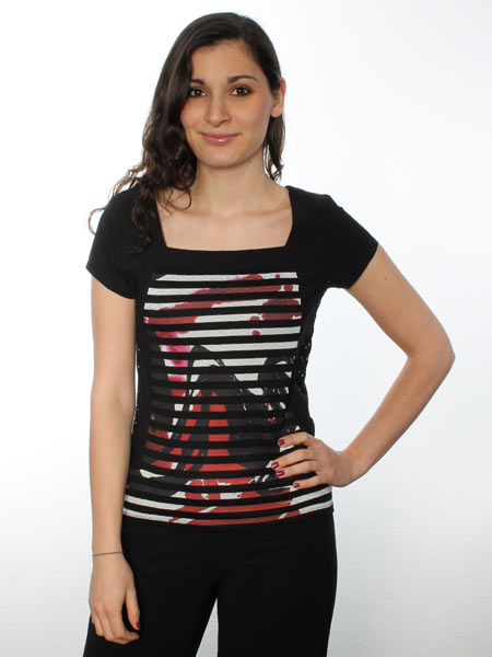 heißt das Gemälde von Toma L auf diesem Shirt von Aventures des Toiles. Das Motiv ist gestrickt aus ganz leichtem Jersey, auch die gestreiften und gepunkteten Partien, kombiniert mit uni schwarzem Stretchstoff. Das Shirt ist leicht tailliert. Länge des Shirts ca. 59 cm.