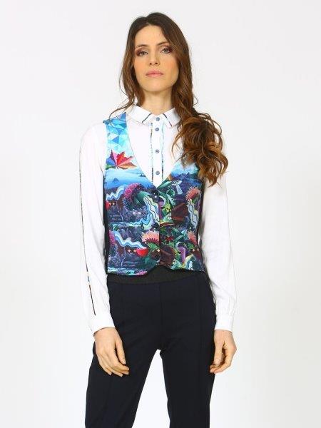 mit dem Gemälde "Étoile du Matin" des Kunstmalers Vincent Ubags ist der etwas dickere elastische Jersey, fühlt sich am wie Samt, bei den Vorderteilen dieser Weste von Aventures des toiles. Diese Partien aus Samt sind unterfütter. Die seitlichen Partien sind aus strukturiertem schwarzen Stoff, das Rückenteil aus schwarzem Jersey. Die Weste ist leicht tailliert, wird mit 3 Knöpfen geschlossen. Länge ca. 51 cm in Gr. 38 am Rückenteil, die Vorderteile sind etwas länger.