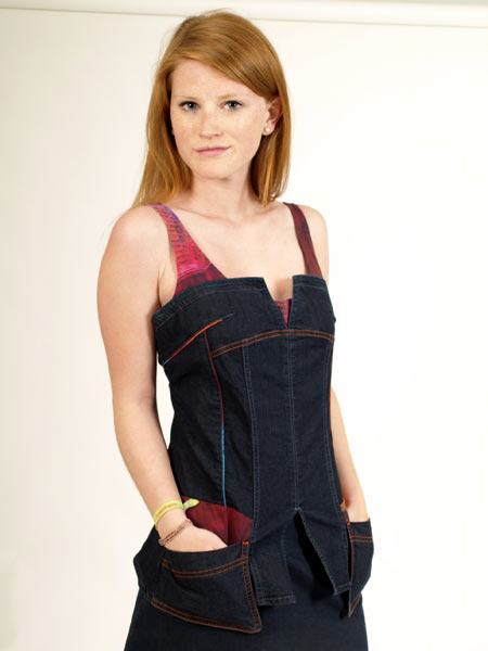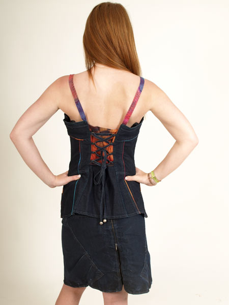 ist dieses Top in Korsettform aus elastischem Jeansstoff von Aventures des Toiles am Rückenteil, mit bedruckten Stoffpartien, mit einem Gemälde von Tibo Streicher. Viele Nähte haben Biesen aus Druckstoff als Hingucker. Tragen Sie dieses Modell im Sommer oder auch im Winter mit einem Shirt darunter. Länge des Tops ca. 65 cm an der vorderen Mitte.