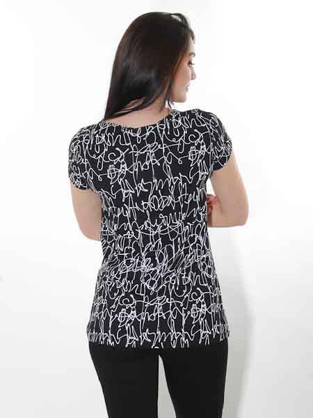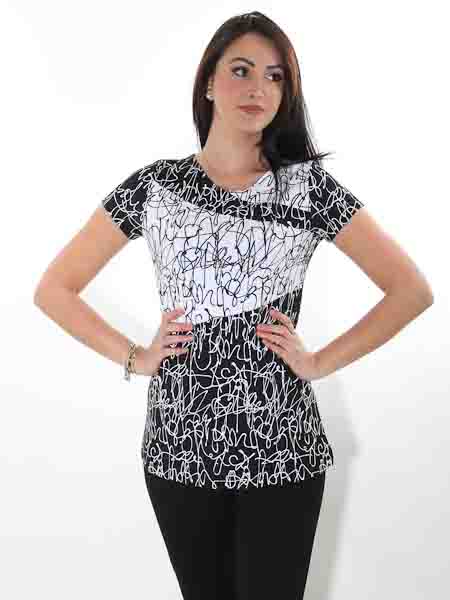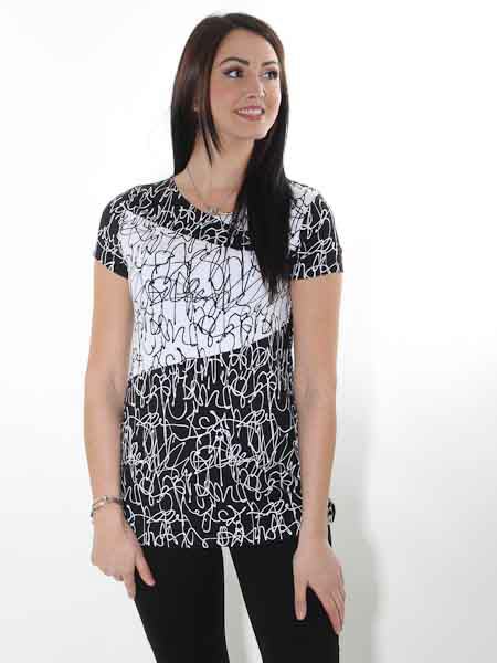 mit dem der elastische Viscosejersey bei diesem Shirt von Dolcezza bedruckt ist, Kunst und Mode aus Kanada. Es hat vorn einen flachen V-Ausschnitt. Die Ärmel sind kurz. Das Rückenteil ist schwarz mit weißen Kritzeleichen bedruckt wie die Ärmel. Länge in Gr. S ca. 74 cm.