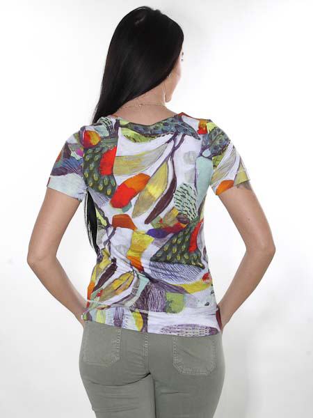 ist die Malerin des Gemäldes, mit dem der Jersey dieses Shirts von Dolcezza bedruckt ist, Kunst und Mode aus Kanada, Es hat einen runden Ausschnitt, an der hinteren Mitte einen kurzen Schlitz mit Knopf und Schlaufe als Verschluß. Viele Nähte sind mit silberfarbenen Kettelnähten betont. Länge in Gr. S ca. 64 cm.