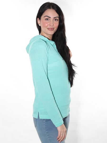 ist das Thema, zu dem dieser Kapuzenpulli von Dolcezza gehört, Kunst und Mode aus Kanada. Wir haben ihn in den Farben citrus und acqua. Er ist in verschiedenen Strukturmustern gestrickt. Die Kapuze hat durchgezogene Strickbänder. Der Pulli ist gerade geschnitten, hat kurze Schlitze in den Seitennähten. Länge in Gr. S ca. 68 cm.