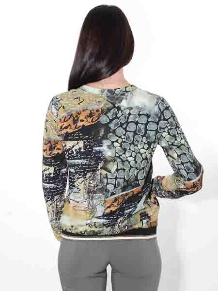 ist die Kunstmalerin des Gemäldes, mit dem der Viscosestoff bei dieser Bluse bedruckt ist, Kunst und Mode aus Kanada. Sie hat einen flachen Kragen, darunter einen V-förmigen Schlitz. Sie ist gerade geschnitten. Die Ärmel sind lang. Die Abschlußbünchen an Vorder- und Rückenteil sowie den Ärmeln sind in Rippe gestrickt in schwarz wollweiß oliv, bei der Farbe oliv schimmert ein Lurexfaden. Länge des Shirts in Gr. S ca. 67 cm.