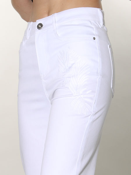 ist das Thema, zu dem diese Hose aus weißem Denimstoff von Dolcezza gehört, Kunst und Mode aus Kanada, high waist. Sie wird mit Metallknopf und Reißverschluß geschlossen. Sie hat vorn 2 Eingrifftaschen, hinten 2 aufgesetzte Potaschen. Der Polyesteranteil im Stoff macht sie angenehm weich. Sie 7/8 lang. Das linke Hosenbein ist oben und das rechte Hosenbein ist unten bestickt mit weißen Gräsern. Länge incl. Bund in Gr. XS ca. 92 cm. 1/2 Saumweite = 21 cm.