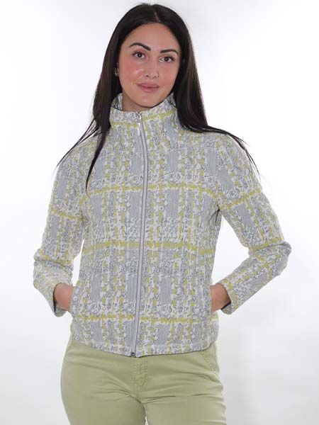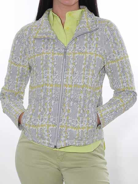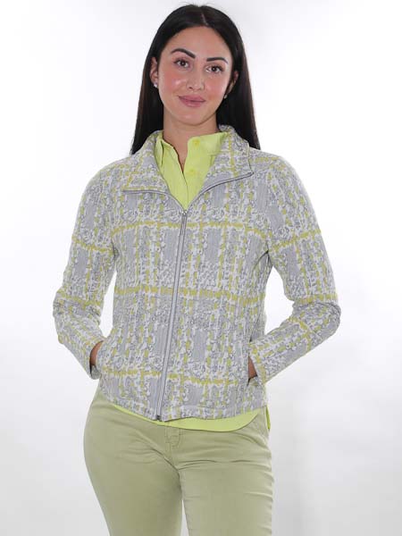 gehört diese Jacke von Dolcezza, Kunst und Mode aus Kanada, aus einem strukturierten Strickstoff in weiß, grau und limone. Sie hat einen hohen Stehkragen, den Sie auch flach tragen können. Sie wird mit einem silbernen Reißverschluß geschlossen. Sie hat 2 senkrechte Pattentaschen. Länge in Gr. S ca. 58 cm.